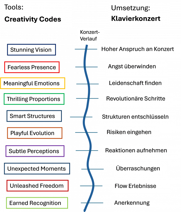 Einige ausgewählte Creativity Codes werden in musikalischer Form am Beispiel von berühmten Werken am Klavier oder E-Piano vorgestellt.